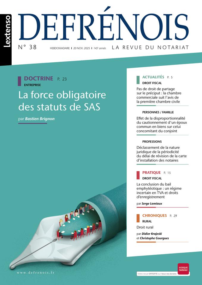 Chaque semaine (depuis le lancement de la nouvelle formule Hebdo le 7 septembre 2017), le Defrénois décrypte pour les professionnels du notariat les dernières évolutions législatives et jurisprudentielles dans tous leurs grands domaines d’expertise : ACTES COURANTS/IMMOBILIER - FAMILLE/PATRIMOINE - ENTREPRISE - FISCAL - PROFESSION - RURAL. À la fois revue d’information et revue scientifique de réflexion et d’imagination, le Defrénois a été repensé pour simplifier leur quotidien : appliquer de nouvelles règles et adopter de nouvelles pratiques dans de nouveaux contextes sociétaux.