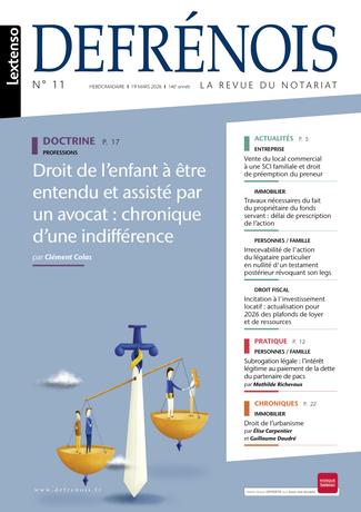Chaque semaine (depuis le lancement de la nouvelle formule Hebdo le 7 septembre 2017), le Defrénois décrypte pour les professionnels du notariat les dernières évolutions législatives et jurisprudentielles dans tous leurs grands domaines d’expertise : ACTES COURANTS/IMMOBILIER - FAMILLE/PATRIMOINE - ENTREPRISE - FISCAL - PROFESSION - RURAL. À la fois revue d’information et revue scientifique de réflexion et d’imagination, le Defrénois a été repensé pour simplifier leur quotidien : appliquer de nouvelles règles et adopter de nouvelles pratiques dans de nouveaux contextes sociétaux.