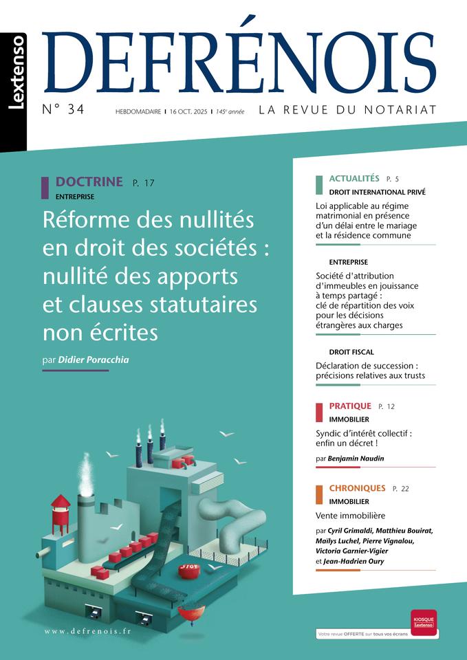 Chaque semaine (depuis le lancement de la nouvelle formule Hebdo le 7 septembre 2017), le Defrénois décrypte pour les professionnels du notariat les dernières évolutions législatives et jurisprudentielles dans tous leurs grands domaines d’expertise : ACTES COURANTS/IMMOBILIER - FAMILLE/PATRIMOINE - ENTREPRISE - FISCAL - PROFESSION - RURAL. À la fois revue d’information et revue scientifique de réflexion et d’imagination, le Defrénois a été repensé pour simplifier leur quotidien : appliquer de nouvelles règles et adopter de nouvelles pratiques dans de nouveaux contextes sociétaux.