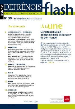 Complément indispensable du Defrénois, le flash offre chaque semaine aux professionnels du notariat et aux praticiens proches de cet univers un accès direct aux informations prioritaires qu’ils doivent maîtriser dans leur exercice quotidien. Mise en perspective et « contextualisée », l’actualité essentielle est dans le flash.