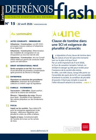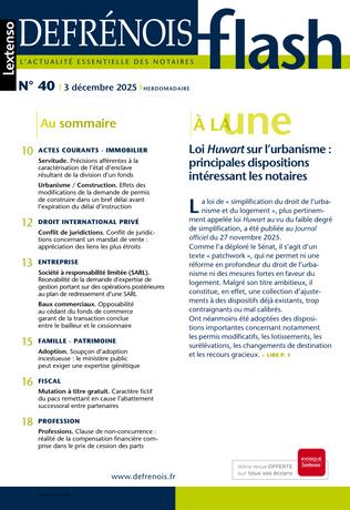Complément indispensable du Defrénois, le flash offre chaque semaine aux professionnels du notariat et aux praticiens proches de cet univers un accès direct aux informations prioritaires qu’ils doivent maîtriser dans leur exercice quotidien. Mise en perspective et « contextualisée », l’actualité essentielle est dans le flash.