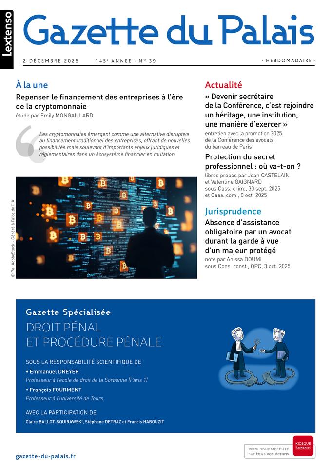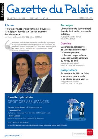 • Un panorama enrichi de l’actualité de la profession • Des analyses juridiques réactives de professionnels renommés • Un dossier « gazette spécialisée » pour suivre l’état du droit et la jurisprudence dans 13 domaines majeurs : Droit des entreprises en difficulté (4 RDV/an) - Droit de la famille (4 RDV/an) - Droit des sociétés (4 RDV/an) - Droit du travail et de la protection sociale (4 RDV/an) - Droit immobilier (4 RDV/an) - Droit pénal et procédure pénale (4 RDV/an) - Procédure civile (4 RDV/an) - Droit bancaire (3 RDV/an) - Droit des assurances (3 RDV/an) - Droit des baux commerciaux (3 RDV/an) - Droit du dommage corporel (3 RDV/an) - Droit privé du patrimoine (3 RDV/an) - Droit fiscal (1 RDV/an)