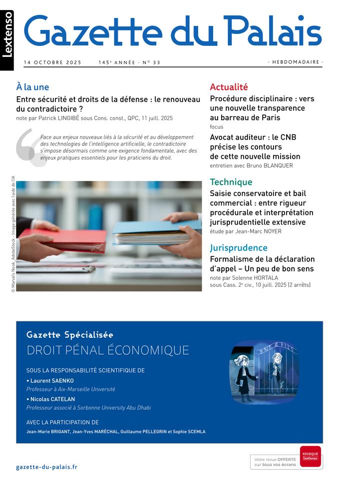 • Un panorama enrichi de l’actualité de la profession • Des analyses juridiques réactives de professionnels renommés • Un dossier « gazette spécialisée » pour suivre l’état du droit et la jurisprudence dans 13 domaines majeurs : Droit des entreprises en difficulté (4 RDV/an) - Droit de la famille (4 RDV/an) - Droit des sociétés (4 RDV/an) - Droit du travail et de la protection sociale (4 RDV/an) - Droit immobilier (4 RDV/an) - Droit pénal et procédure pénale (4 RDV/an) - Procédure civile (4 RDV/an) - Droit bancaire (3 RDV/an) - Droit des assurances (3 RDV/an) - Droit des baux commerciaux (3 RDV/an) - Droit du dommage corporel (3 RDV/an) - Droit privé du patrimoine (3 RDV/an) - Droit fiscal (1 RDV/an)