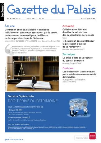 • Un panorama enrichi de l’actualité de la profession • Des analyses juridiques réactives de professionnels renommés • Un dossier « gazette spécialisée » pour suivre l’état du droit et la jurisprudence dans 13 domaines majeurs : Droit des entreprises en difficulté (4 RDV/an) - Droit de la famille (4 RDV/an) - Droit des sociétés (4 RDV/an) - Droit du travail et de la protection sociale (4 RDV/an) - Droit immobilier (4 RDV/an) - Droit pénal et procédure pénale (4 RDV/an) - Procédure civile (4 RDV/an) - Droit bancaire (3 RDV/an) - Droit des assurances (3 RDV/an) - Droit des baux commerciaux (3 RDV/an) - Droit du dommage corporel (3 RDV/an) - Droit privé du patrimoine (3 RDV/an) - Droit fiscal (1 RDV/an)