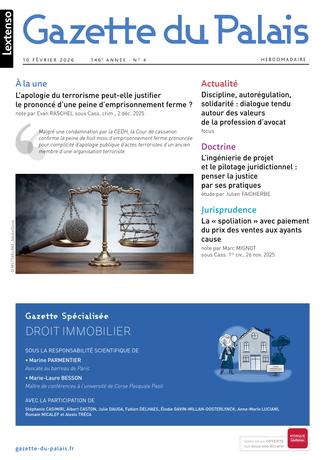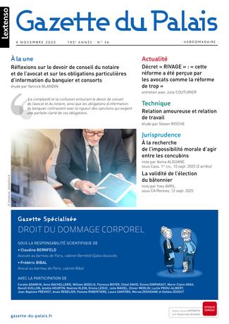 • Un panorama enrichi de l’actualité de la profession • Des analyses juridiques réactives de professionnels renommés • Un dossier « gazette spécialisée » pour suivre l’état du droit et la jurisprudence dans 13 domaines majeurs : Droit des entreprises en difficulté (4 RDV/an) - Droit de la famille (4 RDV/an) - Droit des sociétés (4 RDV/an) - Droit du travail et de la protection sociale (4 RDV/an) - Droit immobilier (4 RDV/an) - Droit pénal et procédure pénale (4 RDV/an) - Procédure civile (4 RDV/an) - Droit bancaire (3 RDV/an) - Droit des assurances (3 RDV/an) - Droit des baux commerciaux (3 RDV/an) - Droit du dommage corporel (3 RDV/an) - Droit privé du patrimoine (3 RDV/an) - Droit fiscal (1 RDV/an)