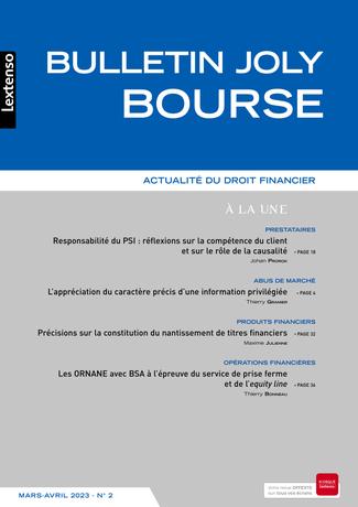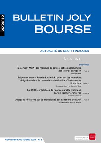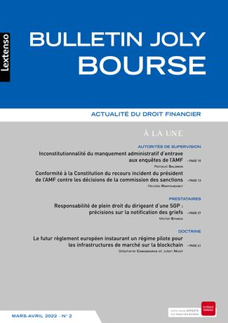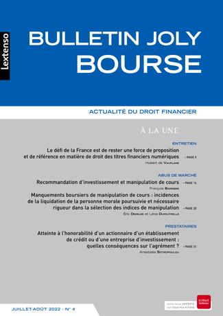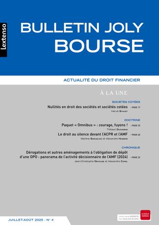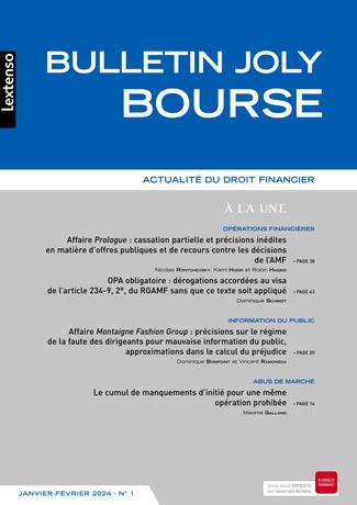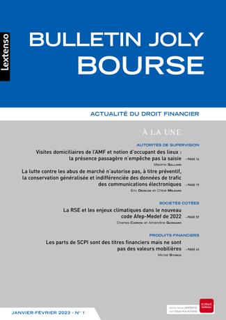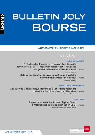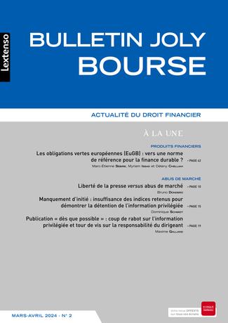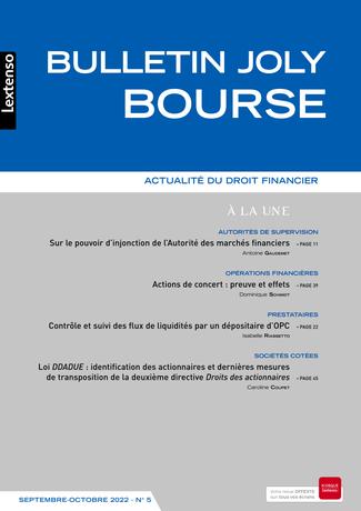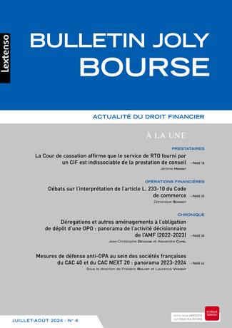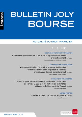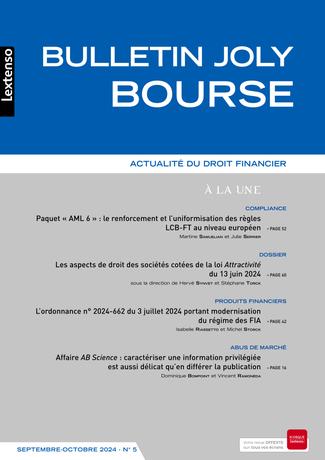 Le Bulletin JOLY Bourse vous offre chaque mois une veille exhaustive de toute l’actualité tant législative que réglementaire du droit financier (Autorités de supervision - Information du public - Prestataires - Techniques et produits financiers - Gestion d’actifs et titrisation - Opérations financières - Conformité et blanchiment des capitaux - Infrastructures de marché - Gouvernance des sociétés cotées).