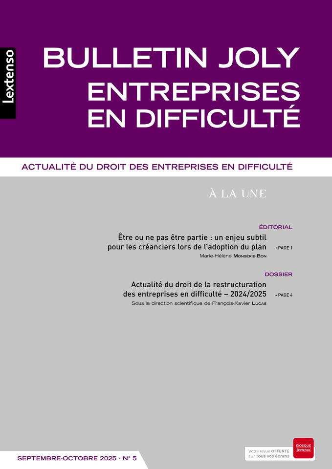Tous les deux mois, retrouvez une analyse fouillée et pratique de l'actualité jurisprudentielle et législative du droit des entreprises en difficulté (Prévention et traitement amiable - Ouverture et extension des procédures collectives – Sauvegarde et redressement judiciaire - Liquidation judiciaire – Créanciers et propriétaires - Droit processuel - Période suspecte, responsabilités et sanctions - Droit social et fiscal - Règlement européen et autres sources – Débiteur personne physique), rédigée par les meilleurs spécialistes de la matière, tant universitaires que praticiens.
