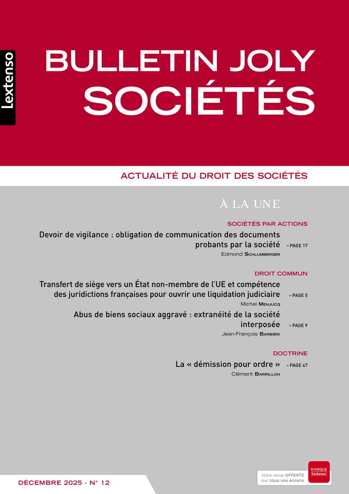 Le Bulletin Joly Sociétés assure chaque mois une veille de toute l'actualité jurisprudentielle et législative du droit des sociétés (Droit commun - Sociétés par actions - Sociétés de personnes et autres groupements - Audit et contrôle des comptes - Fusions acquisitions - Restructuration des sociétés en difficulté).