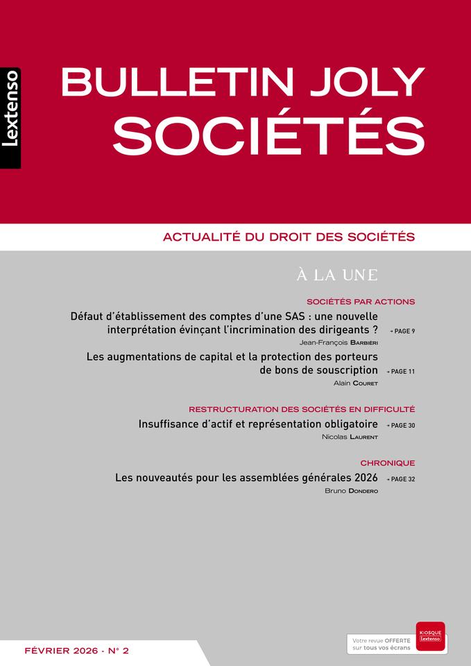 Le Bulletin Joly Sociétés assure chaque mois une veille de toute l'actualité jurisprudentielle et législative du droit des sociétés (Droit commun - Sociétés par actions - Sociétés de personnes et autres groupements - Audit et contrôle des comptes - Fusions acquisitions - Restructuration des sociétés en difficulté).