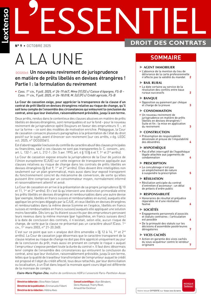 La Cour de cassation exige, pour apprécier la transparence de la clause d’un contrat de prêt libellé en devises étrangères relative au risque de change, qu’il soit tenu compte de l’ensemble des...