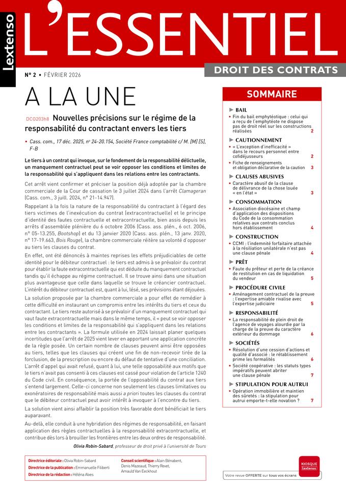 Le tiers à un contrat qui invoque, sur le fondement de la responsabilité délictuelle, un manquement contractuel peut se voir opposer les conditions et limites de la responsabilité qui s'appliquent...