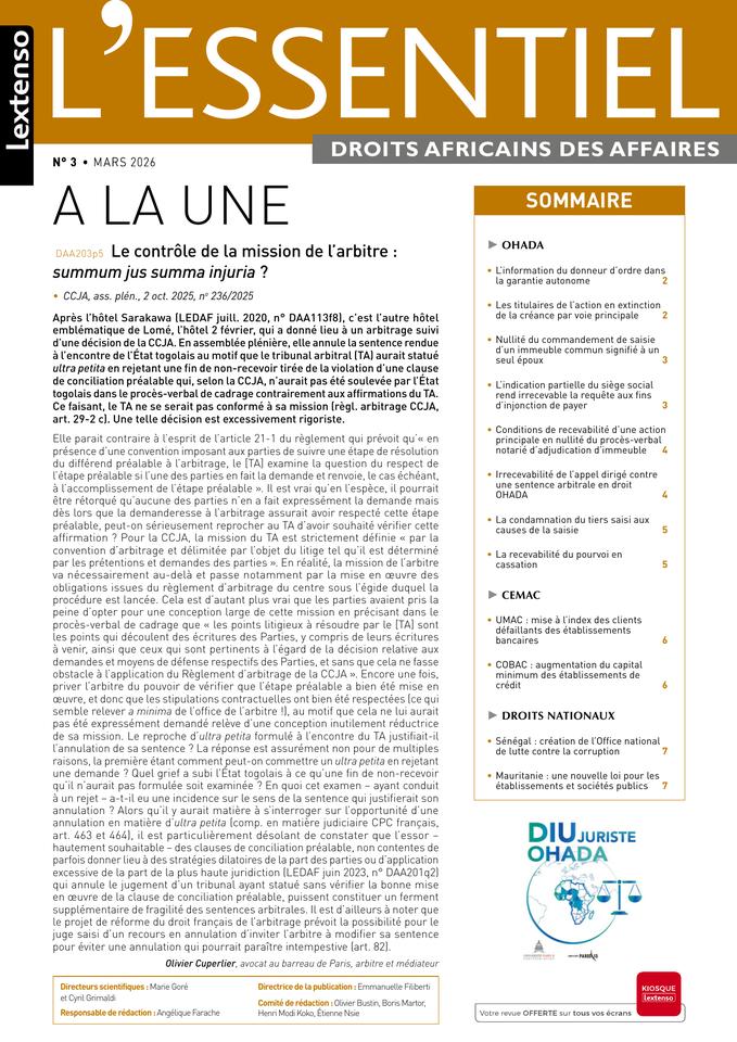 Après l’hôtel Sarakawa (LEDAF juill. 2020, n° DAA113f8), c’est l’autre hôtel emblématique de Lomé, l’hôtel 2 février, qui a donné lieu à un arbitrage suivi d’une décision de la CCJA. En assemblée...